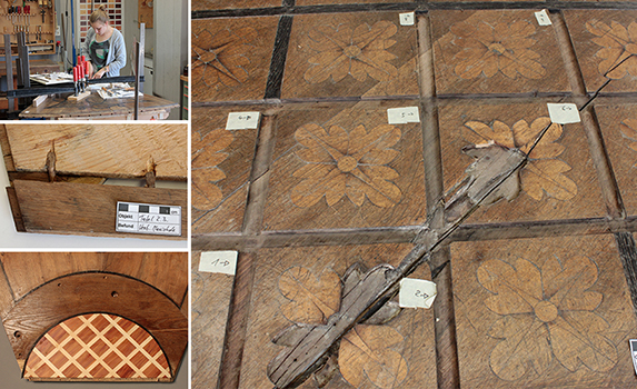 Lokalisierung - Baden-Württemberg, Hersteller vermutl. J. G. Neßtfell Aufbewahrung - privat Inventarnummer - Bearbeitungszeit - 2011/ 12 Aufgaben - Erstellung eines Kon.-/ Rest.-Konzeptes, Wiederherstellung der Konstruktion, Kon./ Rest. des Marketeriebildes, Einbau in ursprüngliche Raumsituation ▸ Dokumentation.pdf ▸ Beschreibung ▸ Zustandsbeschreibung ▸ Konzepterstellung ▸ Bearbeitung ▸ Einbau BearbeitungZur Restaurierung des Tafelparkettes musste gelöste und deformierte Furniere sowie schlecht ausgeführte Ergänzungen vom Träger abgenommen werden. Die ursprünglichen Furniere wurden gereinigt und die deformierten Teile in ihre ursprüngliche Form zurückgeführt. Anschließend wurde die geschädigte Konstruktion stabilisiert, neu verleimt sowie Fehlstelle ergänzt und Risse geschlossen. Dann wurden die Furniere wiederaufgeleimt und Fehlstellen entsprechend ergänzt bzw. gekittet. Nach Fertigstellung der Flächen wurde die gesamte Oberfläche intensiv gereinigt, um Verschmutzungen und verbräunte Überzüge abzunehmen. Abschließend wurden mehrere Wachsschichten aufgetragen und poliert. |