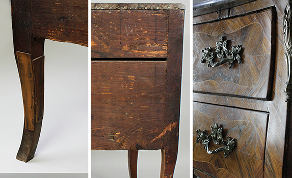 Lokalisierung - deutsch Aufbewahrung - privat Inventarnummer - Bearbeitungszeit - Jan. 2017 Aufgaben - Ergänzung von Fehlstellen im Furnier und der Holzsubstanz, Festigen und Wiederherstellen der Konstruktion, Schübe gangbar machen, Reinigung und Regenerierung der Oberfläche, Reinigung der Beschläge ▸ Beschreibung ▸ Zustandsbeschreibung ▸ Bearbeitung ZUSTANDSBESCHREIBUNGDie Kommode befand sich in einem relativ guten Zustand. Es fanden sich einige Ausbrüche im Furnierbild und an der Holzsubstanz, sowie einige gelöste Furnier. Weiterhin war die Konstruktion leicht durch unsachgemäße Reparaturen und eine geschwundene Rückwand geschwächt. Auch waren die Lauf- und Streichleisten der Schübe abgenutzt und die Gangbarkeit somit beeinträchtigt. Zusätzlich war die Oberfläche leicht verschmutzt und der Überzug wirkte ausgeblichen und stumpf. |