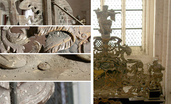 Lokalisierung - St. Nikolai Stralsund Aufbewahrung - Inventarnummer - Bearbeitungszeit - Juni 2006 während des Studiums an der FH Potsdam Aufgaben - Erstellung eines Konzeptes zur Abnahme der stark beschädigten Bekrönung ▸ Dokumentation.pdf ▸ Kurzbeschreibung ▸ Beschreibung der Befestigung ▸ Konzept zur Abnahme KURZBESCHREIBUNGDie zur Verzierung einer Grabkapelle aufgestzte Bekrönung ist 3,15 m hoch und insgesamt 3,67 m breit. Eine ca. 1,06 m hohe Engelsfigur ist als oberer Abschluss auf eine Konsole gestellt. Rechts und links wird die Bekrönung von zwei weiteren ca. 1 m hohen Figuren begrenzt. Sie stehen auf einem 40 cm hohen, quadratischen Sockel direkt vor dem Aufsatz. Zentral in der Mitte ist ein geschnitztes Wappen vorgeblendet. Das Wappen wird von einer durchbrochenen Schnitzerei in Form von Ranken und Voluten schleierbrettartig eingeschlossen. Alle Elemente der Bekrönung sind polychrom gefasst. |