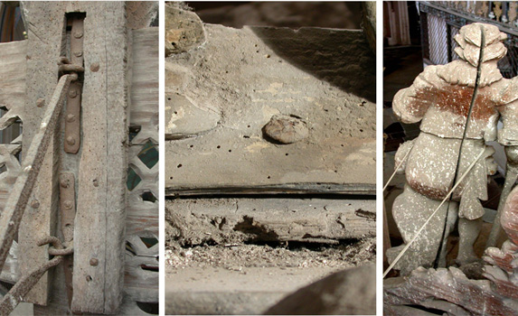 Lokalisierung - St. Nikolai Stralsund Aufbewahrung - Inventarnummer - Bearbeitungszeit - Juni 2006 während des Studiums an der FH Potsdam Aufgaben - Erstellung eines Konzeptes zur Abnahme der stark beschädigten Bekrönung ▸ Dokumentation.pdf ▸ Kurzbeschreibung ▸ Beschreibung der Befestigung ▸ Konzept zur Abnahme BESCHREIBUNG DER BEFESTIGUNGDie gesamte Konstruktion steht auf dem Gesims der Kapellenwand. Mit mindestens fünf geschmiedeten Nägeln (Köpfgröße 17 mm) ist der Aufsatz am Gesims befestigt. Die Nägel wurden von vorn durch das untere Profil geschlagen. Die oben aufgestellte Engelsfigur wird im Fußbereich von hinten ebenfals mit drei Nägeln durch eine senkrechte Bohle gehalten. Die Sockel der linken und rechten Figur sind an der Bekrönung und auf dem Gesims mit Nägeln befestigt. Auch die Figuren sind auf dem Sockel wieder mit Nägeln durch die Grundplatte positioniert. Die gesamte Konstruktion der Bekrönung wird durch zwei Eisenstangen, von der hinteren Mauer ausgehend, gehalten. Die Stangen sind fest in die Wand eingemauert und an der Bekrönung mittels Haken und aufgenagelten Ösen befestigt. |