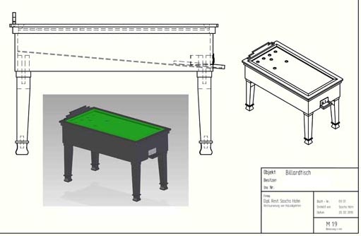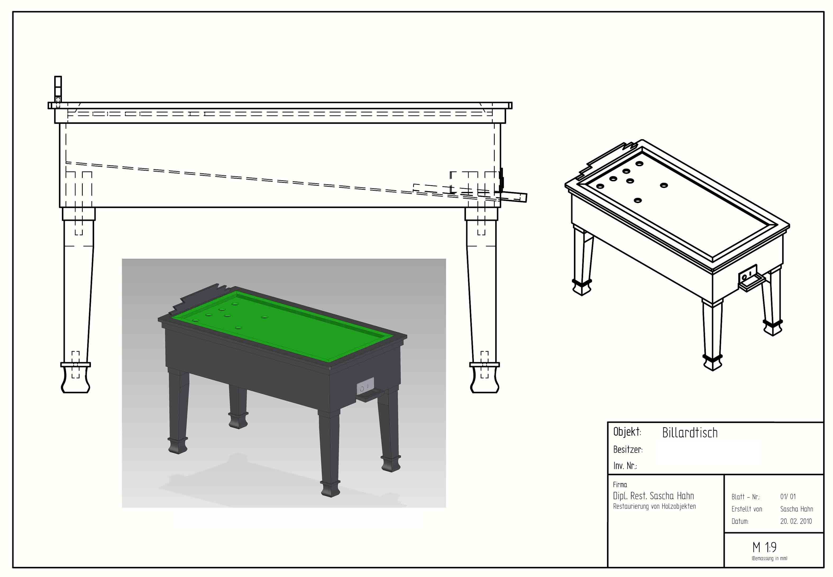 Lokalisierung - Aufbewahrung - privat Inventarnummer - Bearbeitungszeit - Juni 2009 Aufgaben - Wiederherstellen der Konstruktion, Rekonstruktion der Füße, Erneuerung der Oberfläche und der Stoffauflage, Gangbarmachung der Mechanik ▸ Restaurierungsarbeiten ▸ Rekonstruktion der Füsse ▸ Bearbeitung der Mechanik REKONSTRUKTION DER FÜßEDie originalen Füße des Billardtisches sind verloren gegangen somit war es erforderlich neue Füße in angemessener Form nachzubauen. Um eine Vorstellung davon zu erhalten, wie der Tisch mit den Füßen aussieht, wurde ein 3-D-Modell generiert. Nach der Zustimmung des Kunden konnte für die Herstellung der Füße aus dem 3-D-Modell eine technische Zeichnung erstellt werden, nach der die Füße gefertigt wurden. |