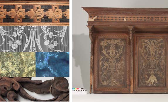 Lokalisierung - Mittelitalien Aufbewahrung - Depot des KGMs Inventarnummer - 1912, 61 Bearbeitungszeit - August 2010, Diplomarbeit Aufgaben - Untersuchung des Zustandes, der Materialien und der Bearbeitungsspuren - Erstellung eines Konservierungs- und Restaurierungskonzeptes - Teilrestaurierung ▸ Dokumentation.pdf ▸ Kurzbeschreibung ▸ weitere Kurzbeschreibung ▸ Zustandsuntersuchung ▸ Materialuntersuchung ▸ Bestimmung von Bearbeitungsspuren ▸ Präsentationsvorschlag der erhaltenen Teile ▸ durchgeführte Maßnahmen KURZBESCHREIBUNGDas Chorgestühl entspricht in seinem Aufbau der typischen Konstruktion eines Gestühls, wie es ab dem 13. Jahrhundert üblich war. Auf einem leicht erhöhten Podest steht eine Sitzbank, die durch Zwischenwangen (ital. alette) in acht Sitze (auch Stallen genannt – ital. stalli, scanni, scanzelli) separiert ist. Die Sitzflächen sind als einfache Platten konstruiert, die nach hinten an die Rückenlehnen (postergale oder schienale) geklappt werden können. Eine Armlehne (auch Accoudoir genannt - bracciale) auf den oberen Enden der Zwischenwangen begrenzt die Sitze. Über die Armlehne erhebt sich der Bereich der Dorsale. Dieser als Rückwand ausgeprägte Bereich ist durch geschnitzte Hochwangen, die die Teilung der Zwischenwangen nach oben fortsetzen, in einzelne Tafeln gegliedert. |