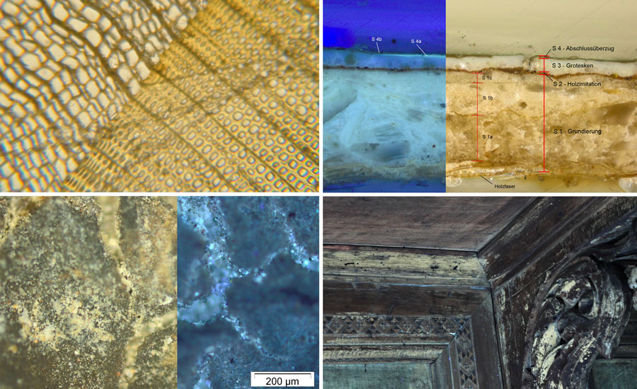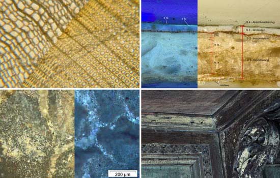 Lokalisierung - Mittelitalien Aufbewahrung - Depot des Kunstgewerbemuseums, Staatliche Museen zu Berlin Inventarnummer - 1912, 61 Bearbeitungszeit - August 2010, Diplomarbeit Aufgaben - Untersuchung des Zustandes, der Materialien und der Bearbeitungsspuren - Erstellung eines Konservierungs- und Restaurierungskonzeptes - Teilrestaurierung ▸ Dokumentation.pdf ▸ Kurzbeschreibung ▸ weitere Kurzbeschreibung ▸ Zustandsuntersuchung ▸ Materialuntersuchung ▸ Bestimmung von Bearbeitungsspuren ▸ Präsentationsvorschlag der erhaltenen Teile ▸ durchgeführte Maßnahmen MATERIALUNTERSUCHUNGAm Chorgestühl konnten drei verschiedene Massivholzarten ermittelt werden. So wurden für die sichtbaren Konstruktionselemente (Rahmen der Rückwandtafeln, beschnitzten Hochwangen und sämtliche Profilleisten) Walnussbaum (Juglans regia L.) verwendet. Die farbig gefassten Blindholzplatten der Dorsaletafeln und nicht sichtbaren Konstruktionsteile des Gesimses sind hingegen aus Pappelholz (Populus spec.) hergestellt worden. Für eingebrachte Ergänzungen aus früher Zeit wurde Fichtenholz (Picea abies (L.) Karst.) mikroskopisch bestimmen. Für die am Objekt eingesetzten Furniere in Form von Blockintarsienbändern konnten beispielsweise Ebenholz (Diospyros spp.), Wachholder (Juniperus spp.), Walnuß (Juglans regia) und Tanne (Abies) bestimmt werden.Die Oberflächenveredelung der holzsichtigen Teile erfolgte mit zwei Überzügen. So konnte zum einen eine rot-braun pigmentierte Leimlösche (Bindemittel – Gummenart, versetzt vermutl. mit Umbra, Terra di Siena und Pflanzenschwarz) ermittelt werden. Die Herstellung und Anwendung eines solchen Überzuges wird im sog. „Bergamo Manuskript“ von 1525 (Herstellungszeitraum des Objekts) detailliert beschrieben. Zum anderen wurde ein Firnis aus natürlichen Harzen festgestellt, dessen genaue Zusammensetzung nicht eindeutig ermittelt werden konnte. Die Rückwandtafeln des Dorsalebereichs hingegen sind durch einen mehrschichtigen Fassungsaufbau in Form einer Intarsienimitation bemalt. Als Abschlussüberzug sind zwei verschiedene Firnisse nachweisbar. Die Bestimmung der einzelnen Bestandteile der Überzüge gelang leider nicht, es kann lediglich eine Öl-Harzmischung vermutet werden, die jedoch keinem Überzug eindeutig zuzuordnen war. |