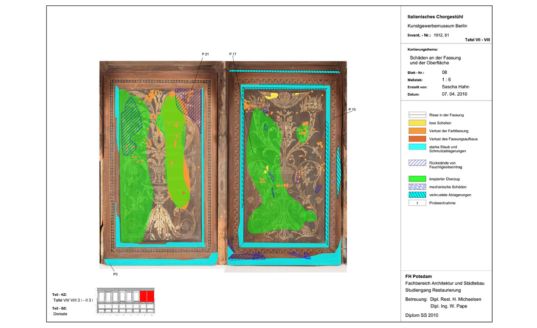Lokalisierung - Mittelitalien Aufbewahrung - Depot des Kunstgewerbemuseums, Staatliche Museen zu Berlin Inventarnummer - 1912, 61 Bearbeitungszeit - August 2010, Diplomarbeit Aufgaben - Untersuchung des Zustandes, der Materialien und der Bearbeitungsspuren - Erstellung eines Konservierungs- und Restaurierungskonzeptes - Teilrestaurierung ▸ Dokumentation.pdf ▸ Kurzbeschreibung ▸ weitere Kurzbeschreibung ▸ Zustandsuntersuchung ▸ Materialuntersuchung ▸ Bestimmung von Bearbeitungsspuren ▸ Präsentationsvorschlag der erhaltenen Teile ▸ durchgeführte Maßnahmen ZUSTANDSUNTERSUCHUNGDas zu untersuchende Chorgestühl lagert im Depot des Kunstgewerbemuseums Berlin im demontierten Zustand, daher wurde im Rahmen der Zustandsuntersuchung zunächst eine Bestandsaufnahme der erhaltenen Teile angefertigt. Anschließend sind die Schäden, Substanzverluste sowie die aus Umbau- und Restaurierungsmaßnahmen hergerufenen Veränderungen in einer Kartierung aufgenommen worden. Basierend auf den gesammelten Informationen konnte dann eine Konservierungs- und Restaurierungskonzept erstellt werden, in welchem geeignete Maßnahmen zur Wiederherstellung des Objekts festgelegt sind. |