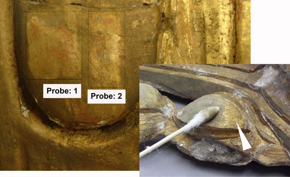 Lokalisierung - Potsdam/Berlin Aufbewahrung - Depot SPSG Inventarnummer - GK VI 134 - 288 Bearbeitungszeit - 2009, Projektarbeit an der FH-Potsdam Aufgaben - Erstellung eines Datenblattes von insgesamt 51 Konsolen, Untersuchung der Materialien, Erstellung eines Konservierungs- und Restaurierungskonzeptes, Umsetzung des Konzeptes ▸ Dokumentation.pdf ▸ Kurzbeschreibung ▸ Schadenskartierung ▸ Materialuntersuchung ▸ Konzepterstellung ▸ Umgang mit Rissen und gelösten Teilen ▸ Festigung der Fassung ▸ Abnahme der Bronzierung ▸ Transport- und Lagersicherung ABNAHME DER BRONZIERUNGAls Hauptproblem bei der Reinigung der Oberfläche erwies sich die Abnahme einer stark verbräunten und verkrusteten Bronzierung, die bei einer Überarbeitung der Konsolen zum verdecken von Schäden aufgetragen wurde. Durch naturwissenschaftliche Untersuchungen konnten Harz und Wachs als Bindemittel eingegrenzt werden. Die Art und Mischung der Komponenten konnte nicht genauer bestimmt werden. Zur Imitation des Goldtons wurde eine Messingverbindung, eine Legierung aus Kupfer und Zink (Mengenverhältnis unbekannt), verwendet. Um ein Mittel zur Abnahme zu finden, wurden umfangreiche Tests mit Lösemittel und einem NL-201.I – Laser durchgeführt. Eine leichte Beeinträchtigung der originalen Oberfläche ließ sich bei keinen der getesteten Mittel vermeiden. Nach Auswertung der Ergebnisse wurde eine Lösung aus Ammoniak, verdünnt mit Aceton auf eine Konzentration von 1 – 5% als am geeignetsten bewertet. |
