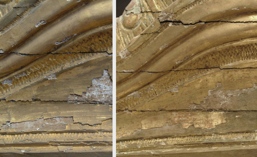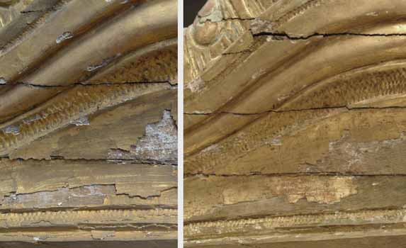 Lokalisierung - Potsdam/Berlin Aufbewahrung - Depot SPSG Inventarnummer - GK VI 134 - 288 Bearbeitungszeit - 2009, Projektarbeit an der FH-Potsdam Aufgaben - Erstellung eines Datenblattes von insgesamt 51 Konsolen, Untersuchung der Materialien, Erstellung eines Konservierungs- und Restaurierungskonzeptes, Umsetzung des Konzeptes ▸ Dokumentation.pdf ▸ Kurzbeschreibung ▸ Schadenskartierung ▸ Materialuntersuchung ▸ Konzepterstellung ▸ Umgang mit Rissen und gelösten Teilen ▸ Festigung der Fassung ▸ Abnahme der Bronzierung ▸ Transport- und Lagersicherung FESTIGUNG DER POLIMENTVERGOLDUNGDie stark craquellierte Fassung der Konsole wurde mit 3%igem Hausenblasenleim über Seidenpapier gefestigt und nach der Trocknung des Leimes mit einem Heizspachtel nachgebügelt. In Schollen hoch stehende Fassungsbereiche sind mit 5%- bis 7%igen Hausenblasenleim gefestigt worden. In mattvergoldeten Bereichen wurde das Festigungsmittel mit einem Pinsel angegeben und überschüssiger Leim sofort mit einem Wattestäbchen abgenommen. |