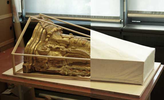 Lokalisierung - Potsdam/Berlin Aufbewahrung - Depot SPSG Inventarnummer - GK VI 134 - 288 Bearbeitungszeit - 2009, Projektarbeit an der FH-Potsdam Aufgaben - Erstellung eines Datenblattes von insgesamt 51 Konsolen, Untersuchung der Materialien, Erstellung eines Konservierungs- und Restaurierungskonzeptes, Umsetzung des Konzeptes ▸ Dokumentation.pdf ▸ Kurzbeschreibung ▸ Schadenskartierung ▸ Materialuntersuchung ▸ Konzepterstellung ▸ Umgang mit Rissen und gelösten Teilen ▸ Festigung der Fassung ▸ Abnahme der Bronzierung ▸ Transport- und Lagersicherung TRANSPORT- UND LAGERSICHERUNGFür den Transport und die Lagerung der Konsole wurde eine Platte mit oberer und seitlicher Rutschsicherung versehen. Die Sicherungen wurden aus 5 x 5 cm großen Kanthölzern gefertigt und auf der Platte verschraubt. Um Beschädigungen an der Konsole zu minimieren wurden sie mit Filz versehen. Um Schmutzablagerungen auf der Konsole zu vermeiden, wurde eine Abdeckhaube aus Holzleisten konstruiert, die mit atmungsaktivem Stoff bezogen wurde. Die Haube wird über die Konsole gestellt und ist in der Ablageplatte mittels loser Dübel fixiert. |