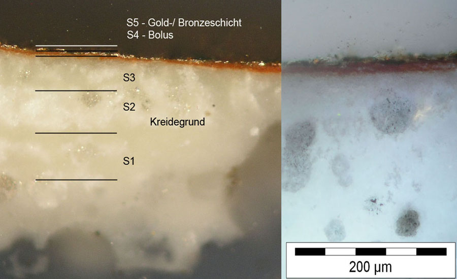 Lokalisierung - Potsdam/Berlin Aufbewahrung - Depot SPSG Inventarnummer - GK VI 134 - 288 Bearbeitungszeit - 2009, Projektarbeit an der FH-Potsdam Aufgaben - Erstellung eines Datenblattes von insgesamt 51 Konsolen, Untersuchung der Materialien, Erstellung eines Konservierungs- und Restaurierungskonzeptes, Umsetzung des Konzeptes ▸ Dokumentation.pdf ▸ Kurzbeschreibung ▸ Schadenskartierung ▸ Materialuntersuchung ▸ Konzepterstellung ▸ Umgang mit Rissen und gelösten Teilen ▸ Festigung der Fassung ▸ Abnahme der Bronzierung ▸ Transport- und Lagersicherung MATERIALUNTERSUCHUNGAn den Konsolen wurden einige naturwissenschaftliche Untersuchungen vorgenommen, um verwendete Materialien genauer bestimmen zu können. So konnte hinsichtlich der Vergoldung beispielsweise ein mehrschichtiger Kreidegrund mit einem Bolus und einer Blattgoldauflage ermittelt werden. Zur Differenzierung des Glanzeffektes wurde das Gold auf den Höhen der Schnitzerei poliert und in den tiefer liegenden Bereichen mit einer Mattierung (vermutlich eine Leimlösche) bestrichen. |