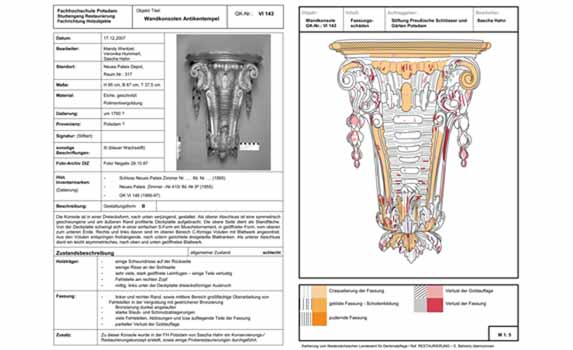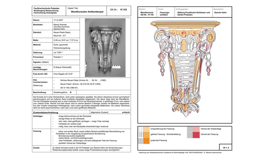 Lokalisierung - Potsdam/Berlin Aufbewahrung - Depot SPSG Inventarnummer - GK VI 134 - 288 Bearbeitungszeit - 2009, Projektarbeit an der FH-Potsdam Aufgaben - Erstellung eines Datenblattes von insgesamt 51 Konsolen, Untersuchung der Materialien, Erstellung eines Konservierungs- und Restaurierungskonzeptes, Umsetzung des Konzeptes ▸ Dokumentation.pdf ▸ Kurzbeschreibung ▸ Schadenskartierung ▸ Materialuntersuchung ▸ Konzepterstellung ▸ Umgang mit Rissen und gelösten Teilen ▸ Festigung der Fassung ▸ Abnahme der Bronzierung ▸ Transport- und Lagersicherung SCHADENSKARTIERUNGZur dokumentarischen Aufnahme der 51 Konsolen wurde zunächst ein Datenblatt erstellt, in dem die hauptsächlichen Merkmale (z.B. Maße, Holzart, besondere Kennzeichen und Zustand) verzeichnet wurden und eine fotografische Aufnahme des Zustandes angehangen ist. Zur Erstellung des Konservierungs- und Restaurierungskonzeptes wurde anschließend eine detaillierte Schadenskartierung der zu bearbeitenden Konsole erstellt. |