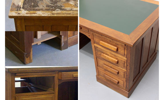 Lokalisierung - Aufbewahrung - Privatbesitz Inventarnummer - Bearbeitungszeit - Sept. 2010 Aufgaben - Wiederherstellung der defekten Konstruktion, Ergänzung fehlender Teile, Ersetzung eines fehlenden Schubes, Erneuerung der Deckplatte ▸ Kurzbeschreibung ▸ Beschreibung der Schäden ▸ Restaurierungsarbeiten KURZBESCHREIBUNGBei dem Objekt handelt es sich um einen klar gegliederten Schreibtisch aus Eichenholz. Die Deckplatte wird von zwei massiv wirkenden Korpen getragen, deren Front jeweils in vier gleich große Schübe unterteilt ist. Direkt unter der Deckplatte befinden sich zwei flache Auszüge, die als weitere Ablage genutzt werden können. |