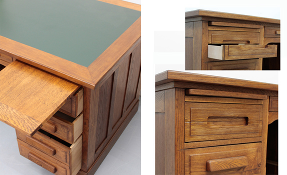 Lokalisierung - Aufbewahrung - Privatbesitz Inventarnummer - Bearbeitungszeit - Sept. 2010 Aufgaben - Wiederherstellung der defekten Konstruktion, Ergänzung fehlender Teile, Ersetzung eines fehlenden Schubes, Erneuerung der Deckplatte ▸ Kurzbeschreibung ▸ Beschreibung der Schäden ▸ Restaurierungsarbeiten RESTAURIERUNGSARBEITENDurch Neuverleimung der gelösten Verbindungen konnte zunächst die Festigkeit der Konstruktion wiederhergestellt werden. Die fehlenden Holzteile wurden durch Ergänzungen in entsprechender Form ersetzt. Der fehlende Schub wurde als Abgrenzung zum Original in freier Form ergänzt. Die Abmaße und Proportionen dieser Ergänzung orientieren sich dabei am Vorbild der restlichen Schübe. Letztlich wurde die Deckplatte ebenfalls in freier Form hergestellt. Gefertigt wurde ein Eichenrahmen auf Gehrung mit einer grünen Linoleumfüllung. Die Ergänzungen wurden in ihrer Farbigkeit den erhaltenen Teilen angepasst. Die Oberfläche der gesamten Holzteile wurde dem Original entsprechend mit einer Schellackmattine behandelt. Als abschließender Überzug ist eine Wachsschicht aufgetragen worden. |