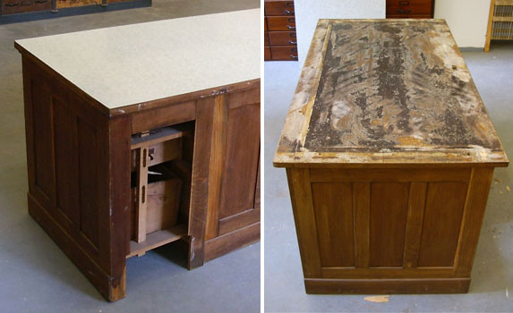 Lokalisierung - Aufbewahrung - Privatbesitz Inventarnummer - Bearbeitungszeit - Sept. 2010 Aufgaben - Wiederherstellung der defekten Konstruktion, Ergänzung fehlender Teile, Ersetzung eines fehlenden Schubes, Erneuerung der Deckplatte ▸ Kurzbeschreibung ▸ Beschreibung der Schäden ▸ Restaurierungsarbeiten BESCHREIBUNG DER SCHÄDENDie Stabilität der Konstruktion war infolge gelöster Leimverbindungen stark beeinträchtigt. Weiterhin waren einige Verluste in der Holzsubstanz zu verzeichnen. So fehlten beispielsweise die Rückwände der beiden Korpen, einige Konstruktionshölzer der Rahmen-/ Füllungskonstruktion und ein Schub im rechten Korpus. Zusätzlich war die Deckplatte so stark beschädigt, dass eine Wiederherstellung in einem angemessenen Kostenrahmen nicht zu realisieren war. |