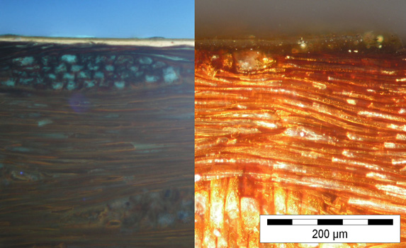 Lokalisierung - Aufbewahrung - Depot des Potsdam Museums Inventarnummer - Bearbeitungszeit - 2006 Aufgaben - Wiederherstellung der Konstruktion, Regenerierung des Oberflächenüberzuges, Reinigung der Beschläge ▸ Dokumentation.pdf ▸ Kurzbeschreibung ▸ Technologische Untersuchung ▸ Materialuntersuchung der Oberflächenüberzüge ▸ Restaurierungsarbeiten ▸ Reinigung der Beschläge MATERIALUNTERSUCHUNG DER OBERFLÄCHENÜBERZÜGEMittels optischer Untersuchung, UV-Lichtbetrachtung und Lösemitteltests nach J. P. Teas konnten zwei unterschiedliche Überzüge eingegrenzt werden. Unter dem Mikroskop zeichnen sich die unterschiedlichen Schichten deutlich in zwei Farbigkeiten ab. Mittels ultravioletter Bestrahlung können diese noch deutlichen voneinander unterschieden werden. Überzug 1 wurde flächendeckend, poliert auf den Objekten angewendet. Als Materialien wurden vermutlich ein Harzüberzug verwendet. Darüber wurde Überzug 2 nur partiell mit einem Pinsel aufgetragen. Hierbei handelt es sich wahrscheinlich um eine Öl-Harz Gemisch. |