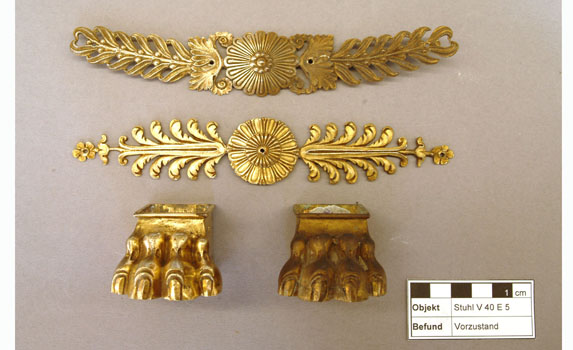 Lokalisierung - Aufbewahrung - Depot des Potsdam Museums Inventarnummer - Bearbeitungszeit - 2006 Aufgaben - Wiederherstellung der Konstruktion, Regenerierung des Oberflächenüberzuges, Reinigung der Beschläge ▸ Dokumentation.pdf ▸ Kurzbeschreibung ▸ Technologische Untersuchung ▸ Materialuntersuchung der Oberflächenüberzüge ▸ Restaurierungsarbeiten ▸ Reinigung der Beschläge REINIGUNG DER BESCHLÄGEDie Beschläge der Stühle wurden zunächst trocken, mit einem Pinsel unter gleichzeitigem Absaugen, von leichten Verschmutzungen gereinigt. Da hiermit kein zufriedenstellendes Ergebnis erzielt werden konnte und stärker haftende Ablagerungen zurückblieben, wurde anschließend eine Nassreinigung mit Kreide gelöst in Ethanol durchgeführt. Hierzu wurde ein Wattetupfer mit dem Gemisch befeuchtet und auf der Oberfläche unter leichtem Druck im Kreis bewegt. Durch die mechanische Einwirkung konten die Ablagerungen so entfernt werden. |