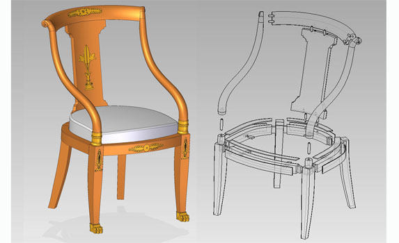 Lokalisierung - Aufbewahrung - Depot des Potsdam Museums Inventarnummer - Bearbeitungszeit - 2006 Aufgaben - Wiederherstellung der Konstruktion, Regenerierung des Oberflächenüberzuges, Reinigung der Beschläge ▸ Dokumentation.pdf ▸ Kurzbeschreibung ▸ Technologische Untersuchung ▸ Materialuntersuchung der Oberflächenüberzüge ▸ Restaurierungsarbeiten ▸ Reinigung der Beschläge TECHNOLOGISCHE UNTERSUCHUNGIm Rahmen der Untersuchung der Objekte erfolgte eine Auseinandersetzung mit dem konstruktiven Aufbau der Stühle. Untersucht und bewertet wurde die Konstruktion hinsichtlich ihrer Stabilität, der verwendeten Verbindungen (Dübel- und Schlitz-/Zapfenverbindungen) und etwaiger Fehlkonstruktionen. Die intensivste Auseinandersetzung mit dieser Problematik findet über das Erstellen einer technischen Zeichnung oder wie in diesem Beispiel über eine dreidimensionale Rekonstruktion statt. Der große Vorteil eines 3-D-Modells ist die anschließende Visualisierung wie in der Abbildung ersichtlich. |