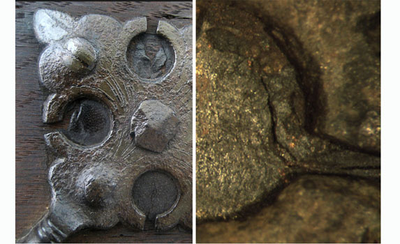 Lokalisierung - westfälisch Aufbewahrung - Ausstellung, GRASSI Museum Inventarnummer - 1927.015 Bearbeitungszeit - April – August 2007 Praktikum im Rahmen des Studiums Aufgaben - Wiederherstellung der originalen Oberflächenfarbigkeit, Rückführung entfernter Medaillons der Stollenfüße ▸ Dokumentation.pdf ▸ Kurzbeschreibung ▸ Restaurierungsgeschichte ▸ Dekoration ▸ Entwicklung des Konservierungs- und Restaurierungskonzeptes ▸ Rückführung der Medaillons DETAILREICHE DEKORATIONZur Dekoration der Korpusflächen sind zahlreiche horizontal und vertikal verlaufende Bandeisen in gleichmäßigen parallelen Abständen angebracht. Die Bänder bestehen aus Eisen und sind mit Nietnägeln am Korpus befestigt. Außer auf der Rückseite enden alle Eisenbänder nach einer kerbbefeielten Rundstange in über Eck gesetzten, quadratischen und stilisierten Blüten, die mit jeweils vier Kreisen durchbrochen sind. Zusätzlich zur schmückenden Funktion unterstützen die Bänder die Konstruktion. So greifen sie von den Flächen auf den Boden und von den Seitenflächen auf die Front- und Rückfläche über. Hinter einigen durchbrochenen Ornamenten der Beschläge finden sich Reste einer Hinterlegung. Diese war vermutlich aus Leder, Pergament oder Papier, welches farbig und mit Gold gestaltet war. Auf den Metallbeschlägen finden sich feine Gravuren und Reste einer Oberflächenveredelung. |