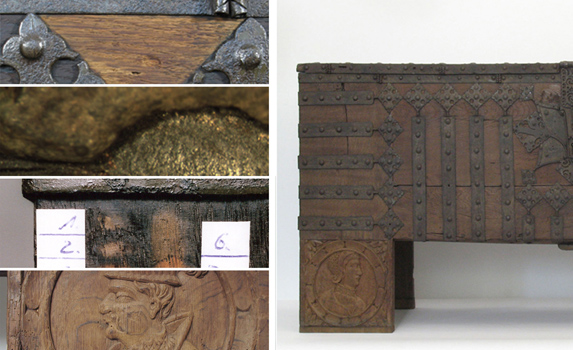 Lokalisierung - westfälisch Aufbewahrung - Ausstellung, GRASSI Museum Inventarnummer - 1927.015 Bearbeitungszeit - April – August 2007 Praktikum im Rahmen des Studiums Aufgaben - Wiederherstellung der originalen Oberflächenfarbigkeit, Rückführung entfernter Medaillons der Stollenfüße ▸ Dokumentation.pdf ▸ Kurzbeschreibung ▸ Restaurierungsgeschichte ▸ Dekoration ▸ Entwicklung des Konservierungs- und Restaurierungskonzeptes ▸ Rückführung der Medaillons KURZBESCHREIBUNGBei dem Objekt handelte es sich um eine mit Eisenbändern beschlagene Truhe des so genannten „westfälischen Typs“. Dieser Möbeltyp wurde über einen langen Zeitraum zwischen dem 15. und 17. Jahrhundert hergestellt und blieb dabei fast unverändert. Die gezeigte Truhe aus dem GRASSI Museum lässt sich anhand der Form der Beschläge und besonders durch die im Stil der Renaissance gefertigten Medaillons der Stollen in die Mitte des 16. Jahrhunderts datieren. Die genaue Herkunft der Truhe ist unbekannt und ist auch nicht auf den westfälischen Raum zu begrenzen, da sich dieser Typus über ein weites Gebiet verbreitet hat und großer Beliebtheit erfreute. |