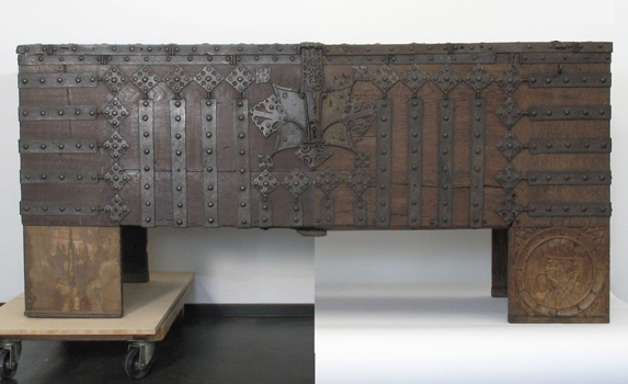 Lokalisierung - westfälisch Aufbewahrung - Ausstellung, GRASSI Museum Inventarnummer - 1927.015 Bearbeitungszeit - April – August 2007 Praktikum im Rahmen des Studiums Aufgaben - Wiederherstellung der originalen Oberflächenfarbigkeit, Rückführung entfernter Medaillons der Stollenfüße ▸ Dokumentation.pdf ▸ Kurzbeschreibung ▸ Restaurierungsgeschichte ▸ Dekoration ▸ Entwicklung des Konservierungs- und Restaurierungskonzeptes ▸ Rückführung der Medaillons RESTAURIERUNGSGESCHICHTEWährend der Aufbewahrung im Museum wurden zwei gravierende Veränderungen an der Truhe vorgenommen. So sind zum einen, aufgrund einer stilistischen Fehlinterpretation, die Medaillons aus den Stollen der Frontansicht entfernt worden. Zum anderen wurde der Holzkorpus bei einer Überarbeitung der Metallbeschläge mit einer Tanninlösung (angewendet zur Eindämmung von Korrosion) dunkelbraun gefärbt. Hervorgerufen wurde die Färbung durch die im Tannin enthaltene Gallussäure (Gerbsäure). Mit dem Eisen(II)oxid (Rost) reagiert Gallussäure zu Eisen(III)-Gallat. Der entstandenen Eisen(III)-Gallatkomplex erzeugt eine schwarze Färbung, die auch als Eisengallustinte bekannt ist (Literaturangaben siehe Dokumentation.pdf). Die Behandlung der Eisenteile erfolgt ohne Rücksicht auf die darunter liegende Holzsubstanz, sodass diese verfärbt wurden. Um eine gleichmäßige Färbung zu erreichen, wurde der Korpus vermutlich zusätzlich mit einer Holzbeize eingefärbt.Mit der Restaurierung der Truhe sollten die Veränderungen weitestgehend rückgängig gemacht werden. Nach eingehenden Untersuchungen und Testreihen (siehe Dokumentation.pdf) konnten geeignete Maßnahmen ermittelt werden, um das gesetzte Ziel zu erreichen. |