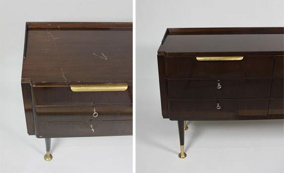 Lokalisierung - Deutschland Aufbewahrung - privat Inventarnummer - Bearbeitungszeit - Feb. 2013 Aufgaben - Wiederherstellen der Oberfläche, Reinigen der Metallbeschläge ▸ Kurzbeschreibung ▸ Kurzbeschreibung der Schäden ▸ Kurzbeschreibung der Bearbeitung KURZBESCHREIBUNG DER BEARBEITUNGVor Beginn der Arbeiten wurden zunächst einige Untersuchungen an den Möbeln durchgeführt, um festzustellen, aus welchem Material der Oberflächenüberzug besteht. Ein Lösemittel- und chemischer Nachweistest ergab, dass ein in Alkohol löslicher Lack auf Nitrocellulosebasis aufgetragen wurde. Basierend auf diesen Erkenntnissen wurden verschiedene Reinigungs- und Regenerierungsmethoden erprobt, die den Glanzgrad des Lacks wiederherstellen sollten. Weiterhin wurden Mittel und Methoden geprüft, um Kratzen und Fehlstellen im Lack zu schließen. Letztlich sind mehrere Möglichkeiten zur Behandlung der Schäden an den Beschlägen getestet worden.Mit den ermittelten Behandlungsmethoden konnten alle Schäden und Beeinträchtigungen erfolgreich behoben werden, so dass die Möbel nach der Restaurierung nun wieder ihre alte Qualität zeigen. |